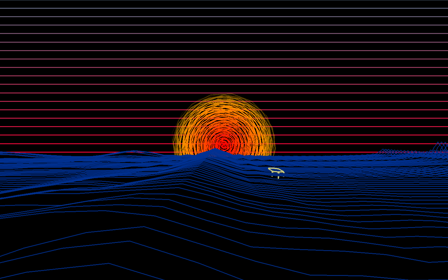 The program used the FFT of the incoming sound to control the waves of an abstract ocean, knocking about an animated surfboard riding into the sunset, while the sun’s spiral graphics responds to the waveform of the same sound input.